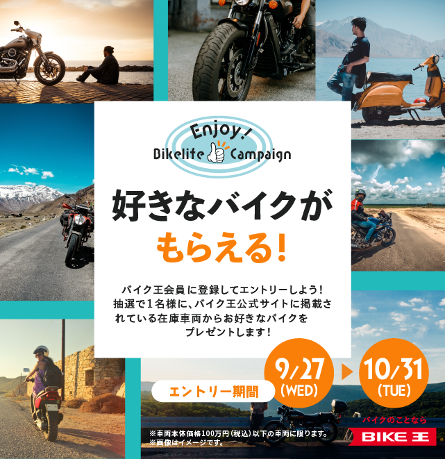 ・応募受付の確認、当選・落選、抽選方法などについてのご質問は受け付けていません・応募にはバイク王会員登録(無料)が必要となります・本キャンペーンへの応募はお一人様一回までとさせていただきます・同⼀⼈物による複数アカウントでの連続応募など、当社の公正なキャンペーン運営を妨害する⾏為と当社が判断した⾏為があった場合、事前予告なく当選を無効とさせていただきます・差額をお支払いいただく場合でも、車両本体価格が100万円(税込)を超える車両はお選びいただけません・納車整備費用、ナンバー登録費用、自賠責保険料はバイク王が負担いたします・車両譲渡により発生した所得税はバイク王が負担いたします・お選びいただく車両により、当選者様に確定申告をしていただく必要がございます・確定申告による税金の増加分は当選者様のご負担となります・インターネット接続料および通信料はお客様のご負担となります・次の場合は応募および当選権利が無効となりますので、ご注意ください
