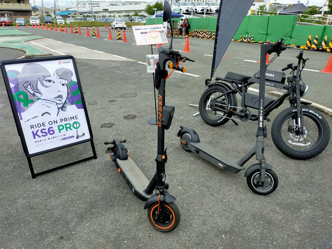 左のオレンジの車体の電動キックボードは最高速度35km(法定速度:30km/h)で走る原動機付自転車となるため今回は展示のみとなりました。