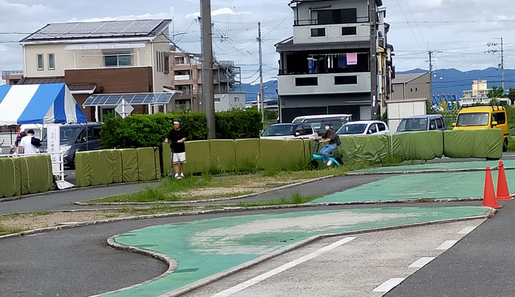 特定小型原付の試乗会は通常教習所のS字・クランクが行われる場所で行われ、一周50メートルほどの距離を1週目は速度を落として周り、慣れてきた2週目は速度を少し上げて楽しむ、といった要領で行われました。