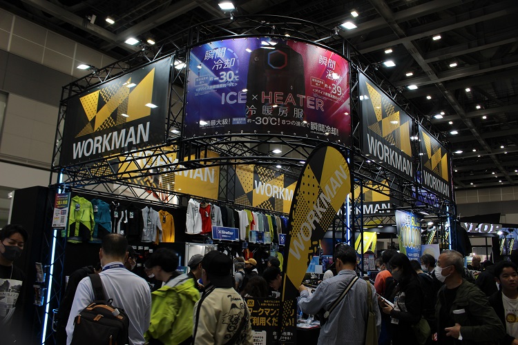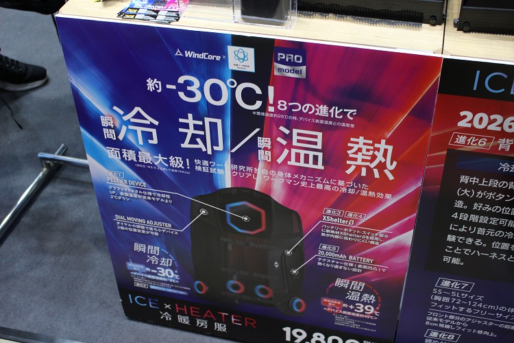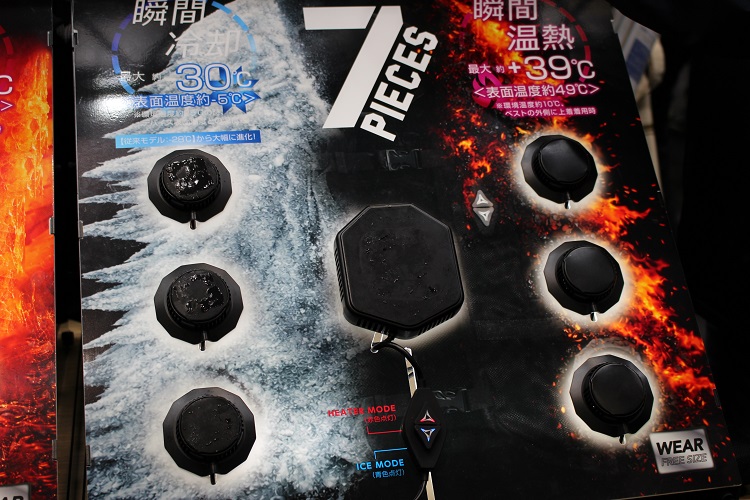 ワークマンブースでまず目を引いたのが、ペルチェ素子を使った冷却・温熱ウェア「ウィンドコアアイス×ヒーターペルチェベスト」の展示です。