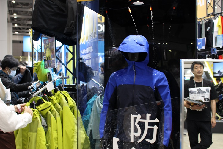レインウェアコーナーでは、水を使った実演展示が行われており、レインウェアを着用したマネキンに上から散水することで、防水性や撥水性を視覚的にわかりやすく表現していました。