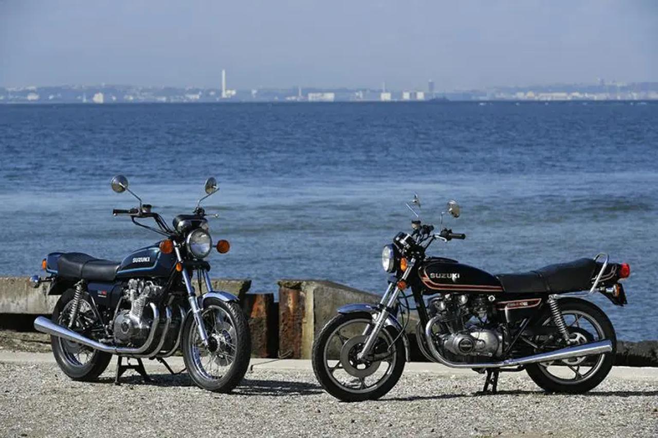 スズキの中大型車両初の4ストローク車、GS750とGS400。優雅なデザインが主流だった当時のモータサイクルとしては男性的な力強さと、無骨さを湛えています。
