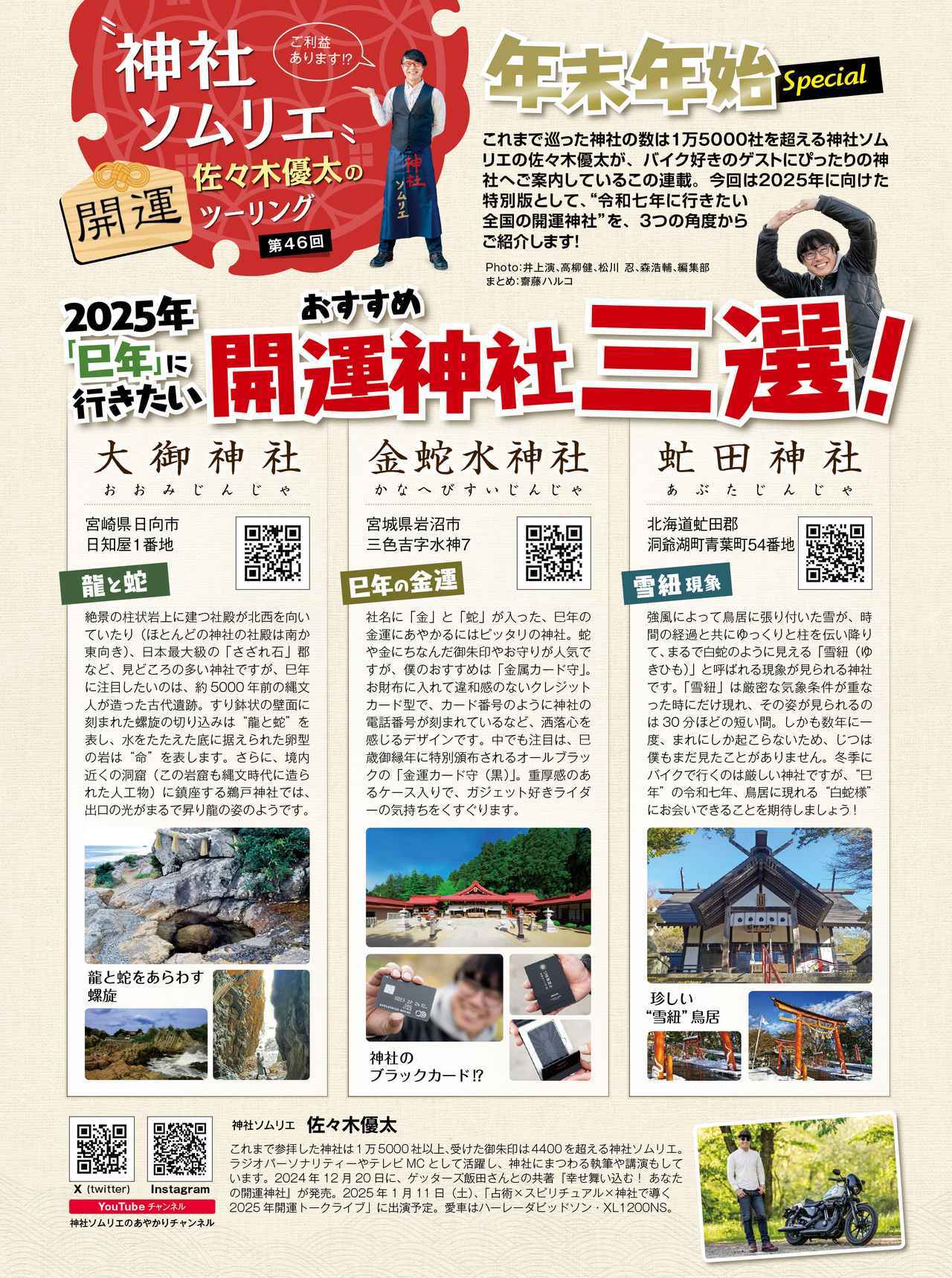 「神社ソムリエの開運ツーリング」は特別回として、2025年「巳年」に行きたい全国の開運神社を紹介! 神社ソムリエの佐々木優太さんが厳選した神社を、健康運や仕事運など運気別にピックアップしました。初詣ツーリングの候補探しにいかが?