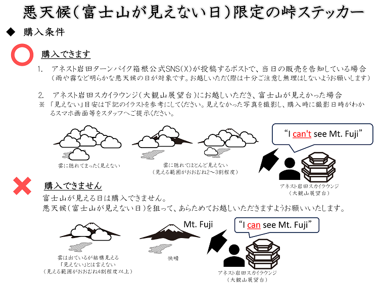 天気がいい日には、ターンパイクの箱根小田原本線終点にある大観山展望台から雄大な富士山を眺めることができます。しかし、曇りや雨の日には富士山を望むことができず、「せっかくターンパイクに来たのに富士山が見れなくて残念」というお客様の声を多くいただいておりました。天気がよくない日のターンパイクでも思い出に残るような体験をしていただきたく、富士山が見えない日だけ購入することができるステッカーの販売を開始いたします。