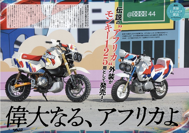前号でお届けしたタイの記事では、CT125ハンターカブ用のDOHCヘッドを紹介したが、タイの取材行脚ではほかにも大注目ネタに遭遇していた。それが、ここで紹介するモンキー 125用のアフリカキットなのだ。
