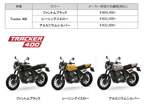 Tracker 400は、ロード上でも確かな存在感を放つフラットトラック・スピリットを体現する1台です。カラーは レーシングイエロー、ファントムブラック、アルミニウムシルバー の3色展開。
