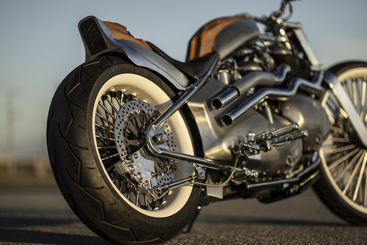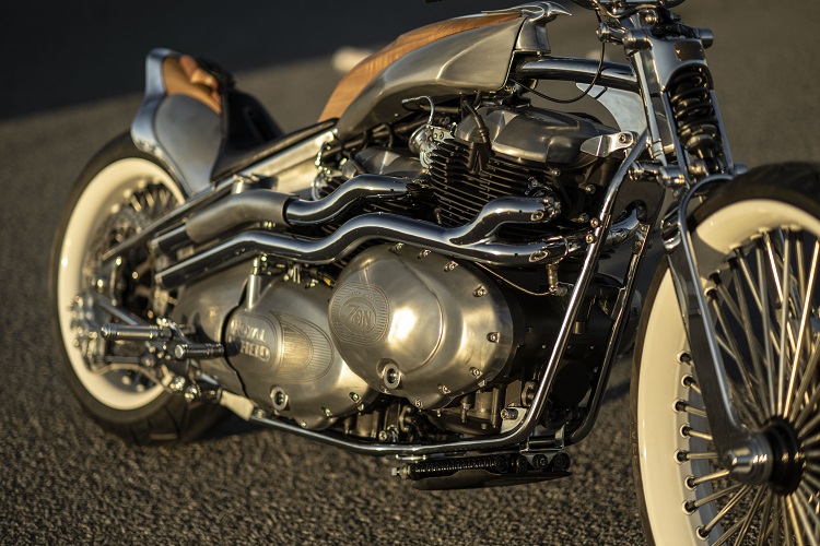 最大の特徴は、ロイヤルエンフィールドの新型車「クラシック 650」の排気量648cc空冷4ストローク並列2気筒SOHC4バルブエンジンを2基搭載していること。前側エンジンのミッションを取り外し、クランクケースを短く加工。前後2つのエンジンを、エンジン左側に配置したプライマリーチェーンによって連結しています。