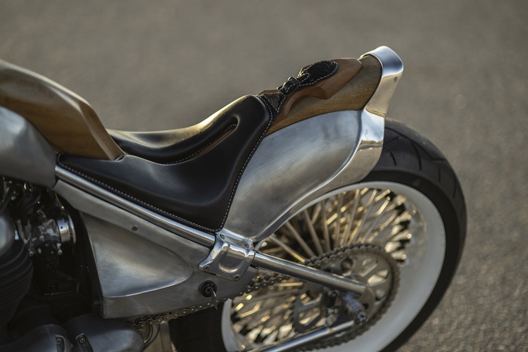 そのエンジンはゼロから製作したオリジナルフレームに搭載しました。独自に設計したクラシカルなガーダーフォークに、26インチというモダンな大径ホイールをセット。モダンとクラシックの融合を果たしています。外装にはマホガニー材を使用。それとリンクする外装類は塗装を廃し、アルミの地肌と木目が美しくリンクしています。