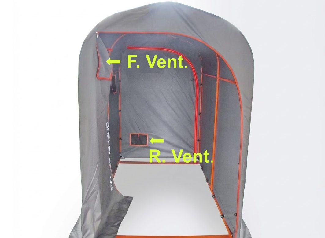 フラップを固定する面ファスナーを長めにし、中央寄りで固定できる設計とすることで、フラップを下向きに保ったまま通気路を確保することが可能です。これにより、雨の侵入を抑えながら換気が可能となり、天候を問わず庫内環境を整えやすくなっています。