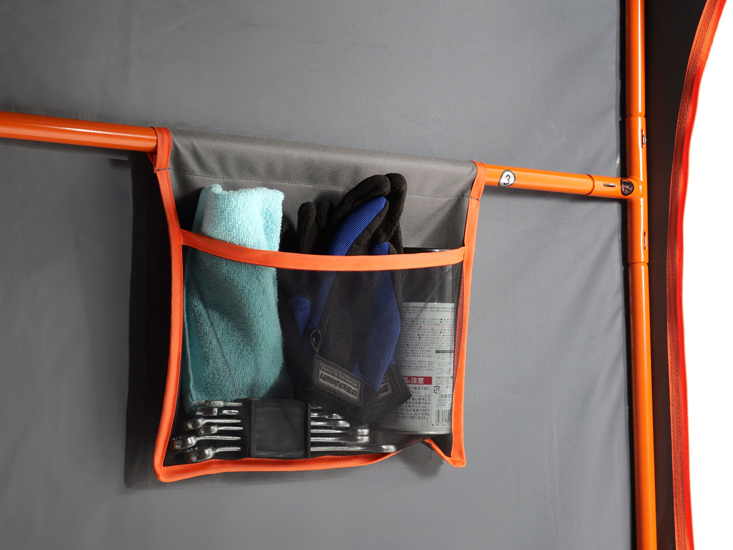 付属のメッシュポケットは、吊り下げ式に変更しました。固定位置に制約されず、ユーザーの使いやすい場所へ自由に配置できるため、メンテナンス用品や小物類の収納性が向上しています。