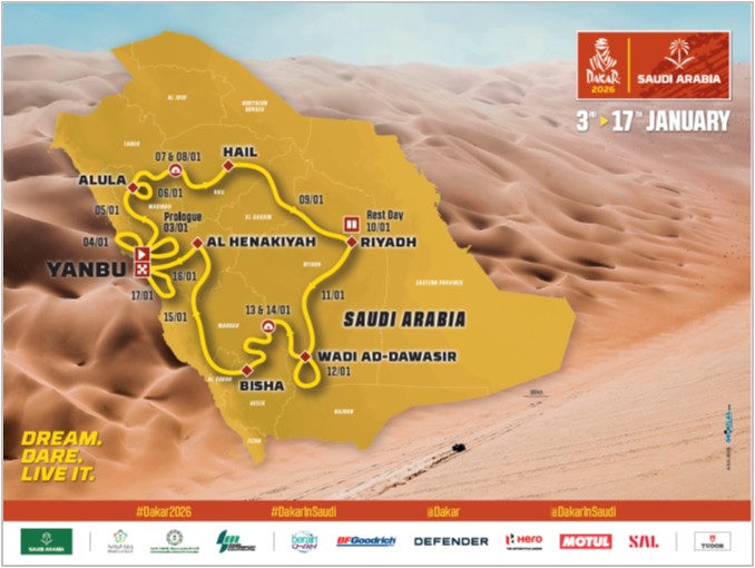 2026年「ダカール・ラリー」のスタート・ゴール地点は紅海の港町ヤンブー。全行程7,983kmの内、4,737kmがSS(競技区間)で、2回のマラソンステージも設定されていました。マラソンステージとは、メカニックや外部のサポートを受けずに2日間のステージを走り切るもので、簡易ビバークでライダー自らがテントを張って睡眠をとり、マシンの整備をしなければいけません。