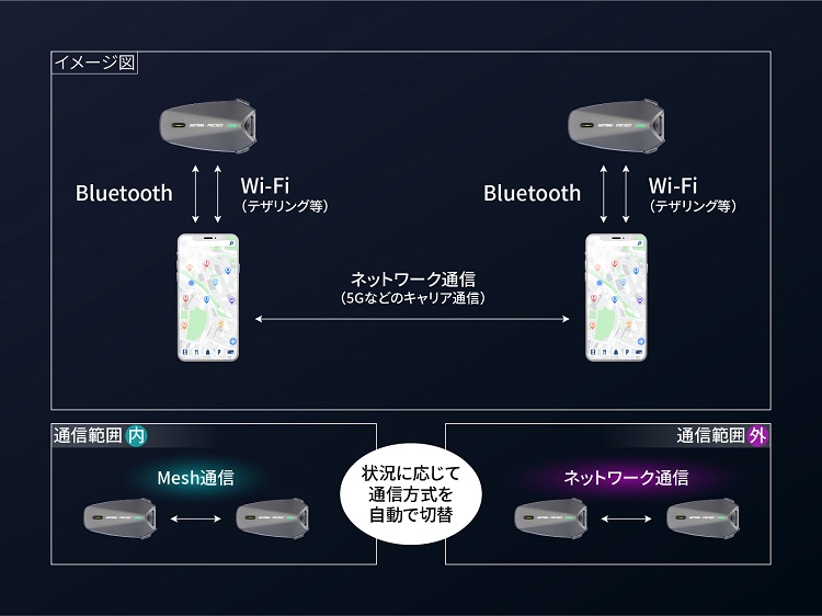 メッシュ通信の通信範囲内はメッシュで接続し、通信範囲を超えると自動的にネットワーク通信へ切り替わる通信方法。状況に応じて通信方法をシームレスに切り替えることで、常に安定した会話を楽しめます。