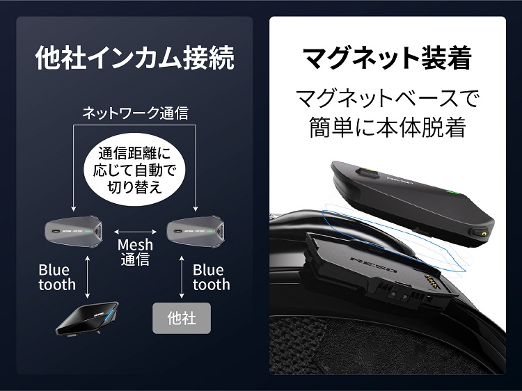 他社インカムとの接続も可能/本体はマグネットで簡単脱着