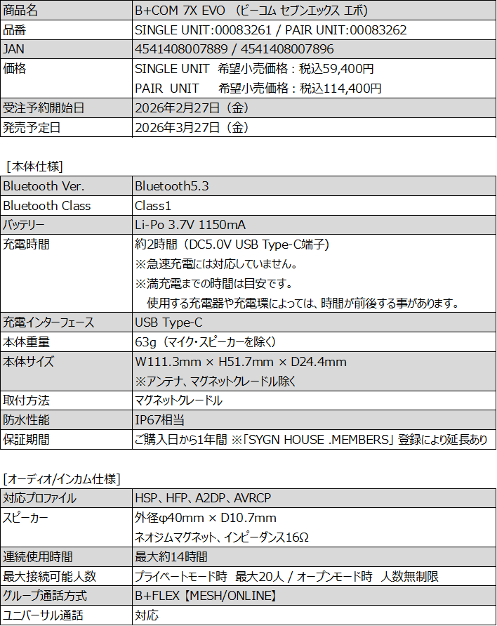 オートバイ用インカムB+COMシリーズを企画・製造・販売している株式会社サイン・ハウス(本社:神奈川県川崎市 / 代表取締役社長:新井 敬史)は、「B+COM」シリーズの最新ハイエンドモデル「B+COM 7X EVO」(SINGLE UNIT希望小売価格:税込59,400円 / PAIR UNIT 希望小売価格:税込114,400円)[直安1] を3月27日(金)に発売いたします。
