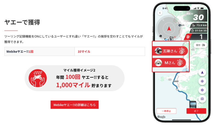 1kmの走行で1マイル、ライダー同士の挨拶「Webikeヤエー」で10マイル獲得!貯まったマイルはお買い物や特別な体験に。