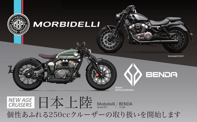 特設サイト new age cruisers最後に、今回のプロトブース最大のトピックとして、新たに取り扱いを開始する車両メーカー、イタリア老舗ブランドのアイデンティティを受け継ぎ誕生した Morbidelli(モルビデリ)と新進気鋭のハイテク企業が手掛けるクルーザー BENDA(ベンダ) を初披露します。