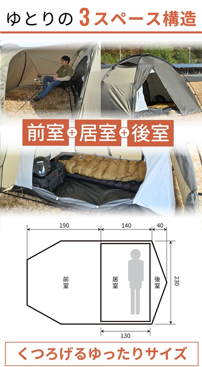 広々とした前室は、大きなキャンプギアを置くストレージとしてはもちろん、チェアに深く腰掛けてコーヒーを楽しむリビングスペースとしても活躍できます。一方で後室は、汚れがちなライディングブーツや就寝時に場所を取りがちな手荷物の一時保管場所として使用可能です。この「前後室」を分けた贅沢な設計により、ソロキャンプでも閉塞感を感じることなく、自宅のリビングにいるような開放感に包まれてゆったりと一夜を過ごせます。