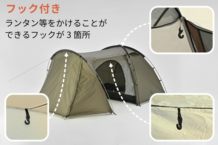 テント内の3箇所にランタンフックを配置しました。メイン照明で室内全体を明るく照らすのはもちろん、就寝前の読書には枕元、着替えや荷物整理には足元など、用途に合わせて最適なライティングが選べます。複数の明かりを組み合わせることで、夜のテント内をより温かみのあるリラックスした雰囲気に演出できるのも嬉しいポイントです。