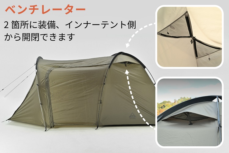 空気の通り道となるベンチレーターを2箇所に設置。インナーテントの中から手を伸ばして開閉できるので。わざわざ外に出る必要がありません。夜中に冷え込んできた際や急な雨でも、シュラフに入ったまま温度調整が可能。テント内の空気を循環させることで、不快な結露の発生も最小限に抑え、朝まで快適に過ごせます。