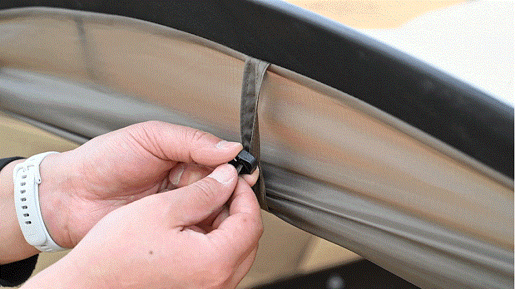 テント入り口を巻き上げて固定するトグルには、調整が容易なアジャスター付きパーツを採用しました。従来のトグルは指先の力が必要で手間取ることもありましたが、これならグローブをしたままでも軽い力で片手操作が可能。誰でも素早く、見た目も美しく生地をまとめることができ、テントの設営・撤収時や頻繁な出入りに伴う小さなストレスを解消してくれます。