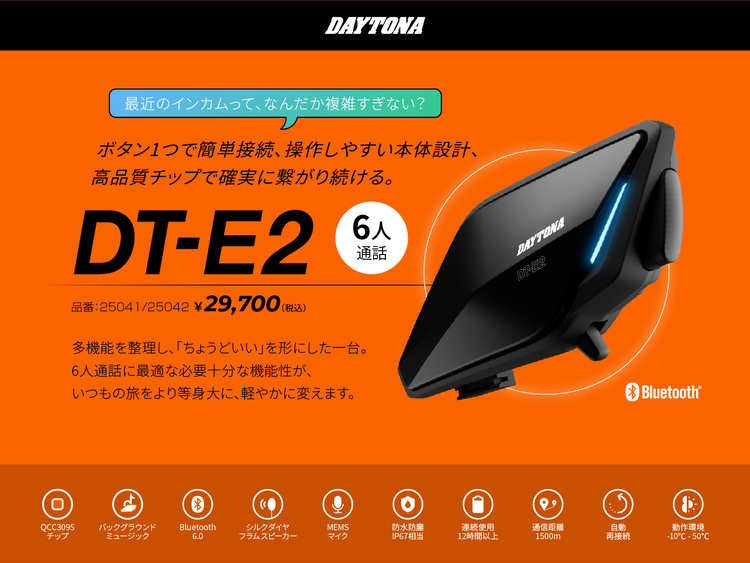 簡単操作のデイトナオリジナルバイク用インカム「DT-E2」(展示会場:大阪、東京、名古屋)