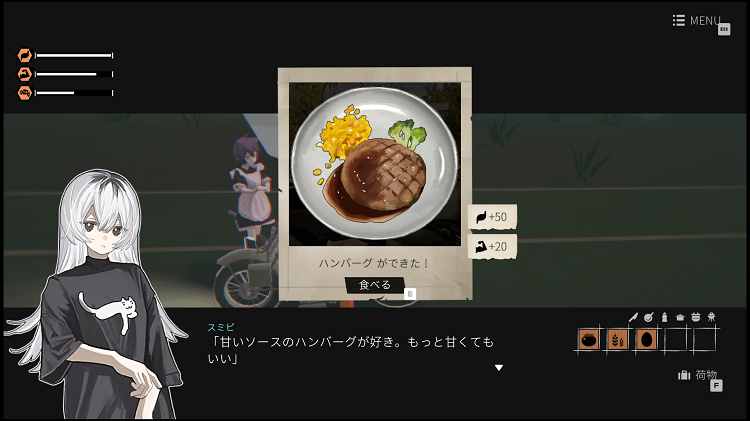 料理をして満腹度やほかのパラメータを回復しましょう。