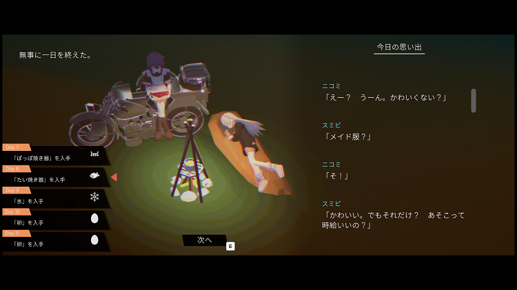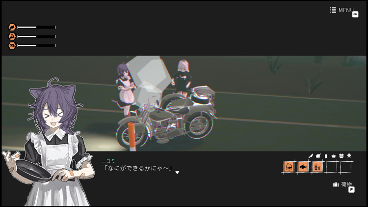 多くのゲームでは目的地に到達することで物語が進んでいきますが、『ガールズメイドプディング』では、バイクに乗って道を進む「道中」で物語が進行していきます。