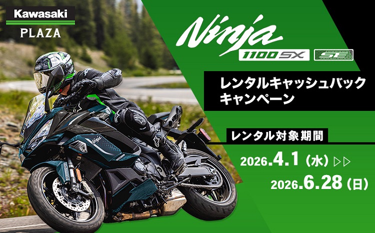 株式会社カワサキモータースジャパン(本社:兵庫県明石市、代表取締役社長:佐伯 健児)が展開するカワサキプラザネットワークでは、全国のカワサキプラザで期間中にNinja 1100SXシリーズをレンタルいただいた後、”Ninja 1100SXシリーズ”及び“Ninja 1000SXシリーズ”の新車をご成約いただいた方に、最大24時間プラン(税込 20,100円)のレンタル費用をキャッシュバックする「Ninja 1100SX レンタルキャッシュバックキャンペーン」を実施中です。
