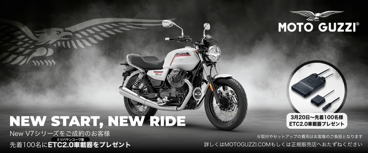 ピアッジオグループジャパン株式会社(本社:東京都港区芝二丁目、代表取締役:レルヒ M. 健治)は、V7シリーズの新車をご成約されたお客様に、ETC車載器をプレゼントするキャンペーン『NEW START, NEW RIDE』を2026年3月20日(金)より全国のモト・グッツィ正規販売店にて開始いたします。