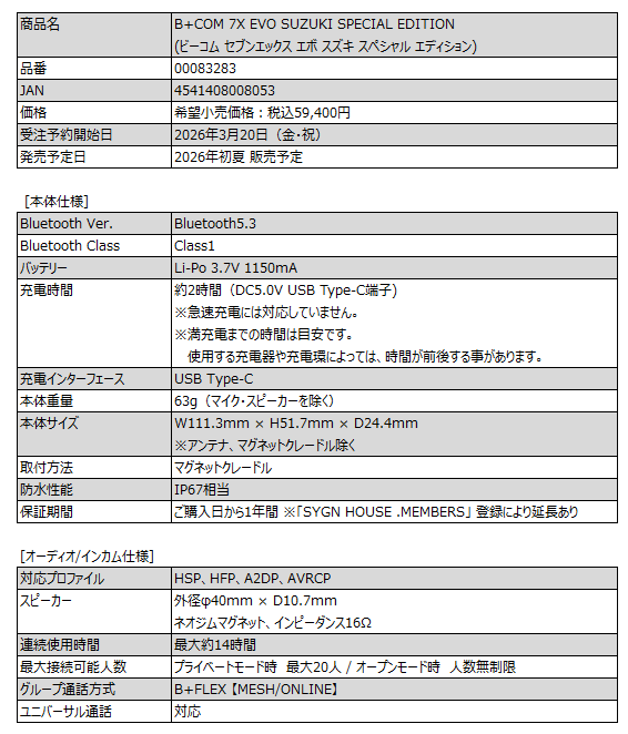 オートバイ⽤インカムB+COM シリーズを企画・製造・販売する株式会社サイン・ハウス(本社︓神奈川県川崎市 / 代表取締役社⻑︓新井 敬史)は、スズキ株式会社とコラボレーションした数量限定の特別カラーモデル「B+COM 7X EVO SUZUKI SPECIAL EDITION」を発売致します。