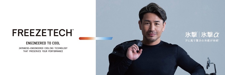 汗と風で驚きの冷感が持続する(※1)フリーズテック。生地の裏側に<氷撃冷感プリント>を施しているのが特徴となり、このプリントが汗や水分を吸収すると、その吸熱特性(※2)により生地温度が下がり、冷感を付与します。さらに、風を受けることにより冷感を強く感じることができるため、ツーリングなどのバイク走行時はもちろん、炎天下での屋外作業でもご活用いただいています。