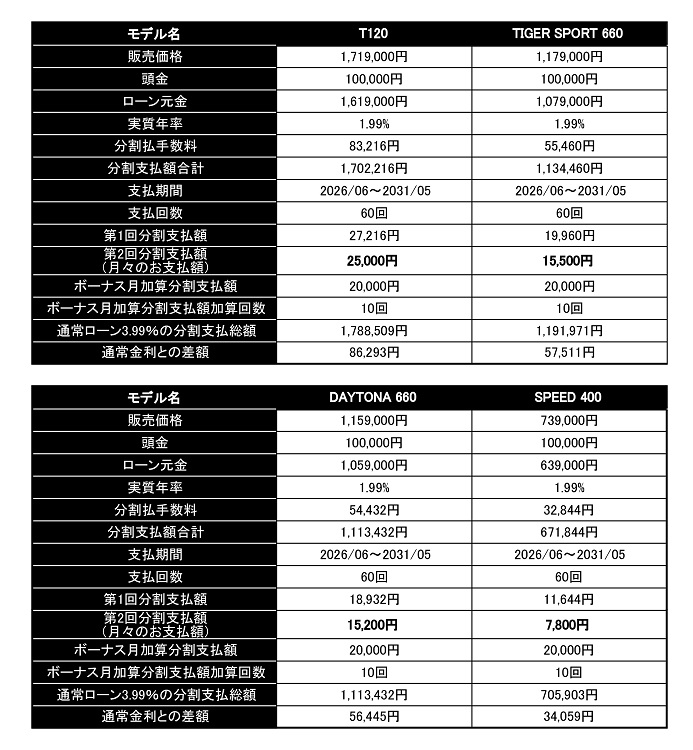 トライアンフの人気の新車を対象とした1.99% 特別金利ローンが登場。