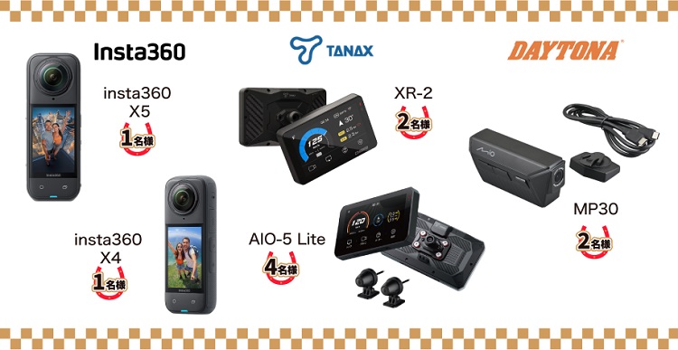 2025年1月4日(土)から1月31日(金)までの期間中、ご来店のうえバイク購入のお見積りいただいた方の中から、アクションカメラやドライブレコーダー、スマートライドモニターなど豪華バイクアクセサリーが抽選で当たる「新春大抽選会」を実施いたします!