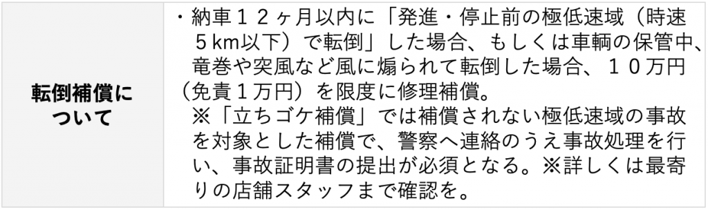 そんな、より新人ライダーに寄り添った特典として、新たに「立ちゴケ補償プレミアム」を導入した。補償の詳細は以下の通り。