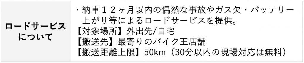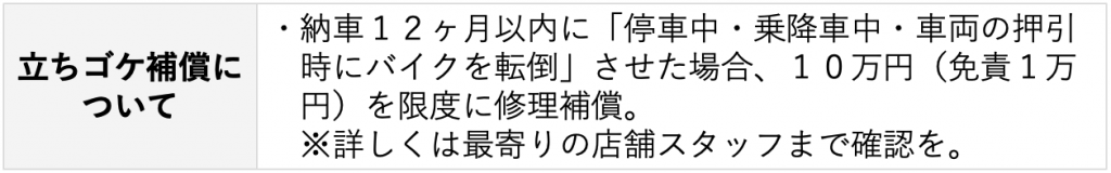 「新しい車両の取り扱いに不安がある」「免許取得したばかりで転倒しないか不安」という、実際にバイク王を利用しているライダーの声から生まれたサービスで、納車から12ヶ月間、立ちゴケや極低速域転倒に対し、10万円(免責1万円)を限度に修理補償をしてくれる。