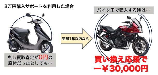 「買い換え応援キャンペーン」はバイク王で新たにバイクを購入する人を対象としたキャンペーン。
