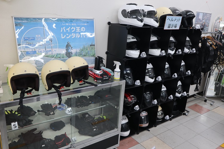 各種ヘルメットやグローブ、そのほかライダーズギアのレンタルも行っているので少ない荷物で来店してレンタルバイクツーリングを楽しむことも可能です。