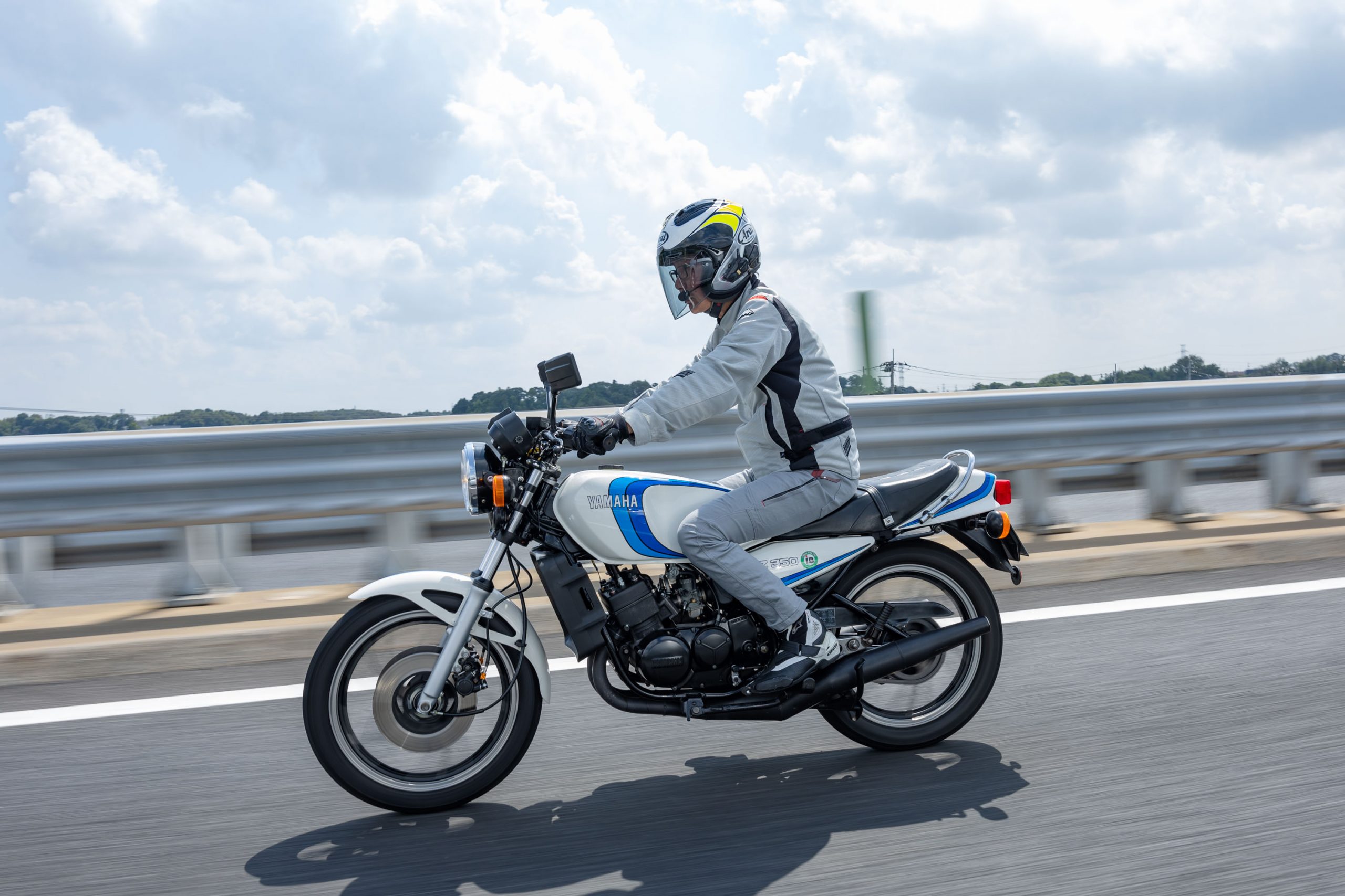 試乗日は気温が34℃で湿度も高かったため、キャブレーション(空燃比)セッティングが全体に濃い目と感じたが、RZ250より排気量が大きくトルクが太いのでゼロ発進時にスロットル開度と半クラッチに気を遣う必要はなく、渋滞路も苦にならないし、高速道路の100km/hクルージングでも余裕たっぷりで、ごく普通にツーリングできる。
