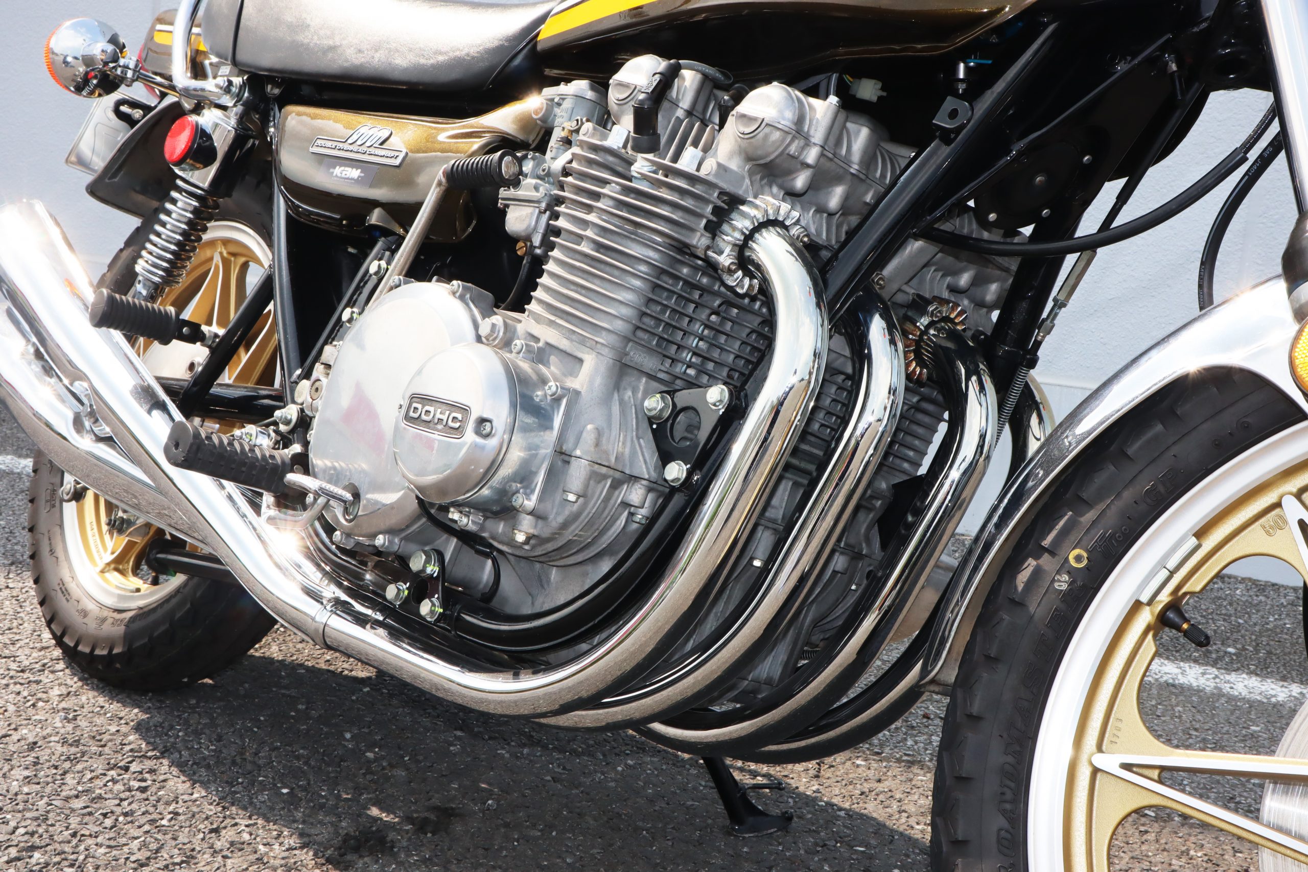 エンジンから伸びるエキパイと、マフラーの艶やかさ。ヘッドライト上に鎮座する砲弾型メーターに金色に輝くカスタムパーツのセブンスターホイールなど、“ザ・バイク”といった佇まいに、否応なく気分が上がります。