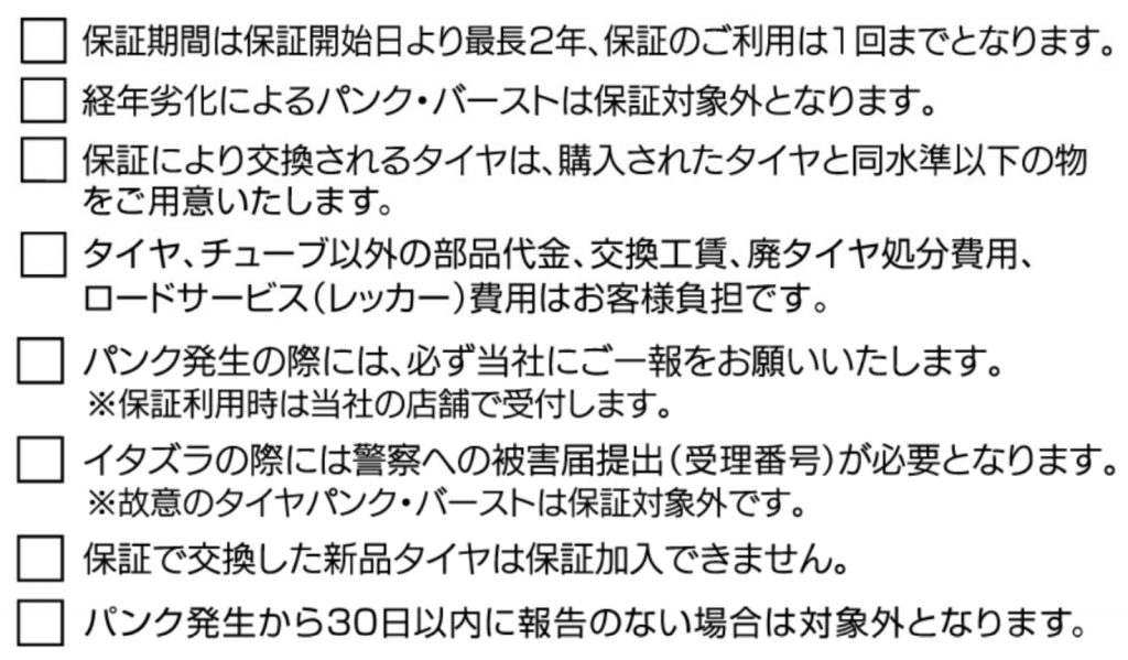 とはいえ、「故意のパンクは保証されない」「パンク発生から30日以内に報告が必要」など、特に難しい条件ではないので安心です。