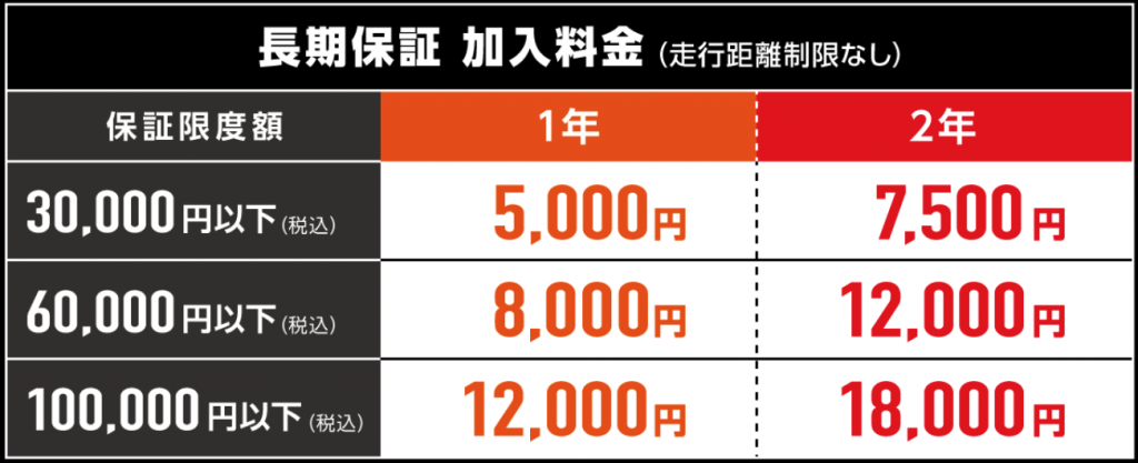 期間としては倍になりますが、どの保証限度額を選択しても2年目は1年目の半額です。例えば、最も高額な10万円以下(税込)の保証限度額を見てみると、1年保証の場合は12000円ですが、2年保証は場合は18000円。