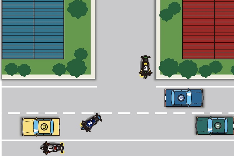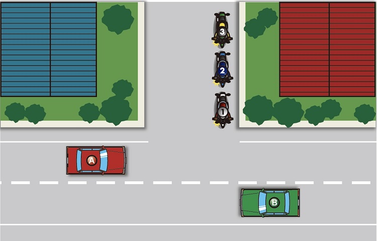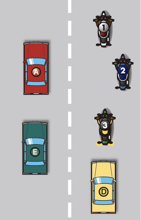 複数台のバイクで走る際、一般的には、図のように左右が交互になりながら等間隔で走る『千鳥走行(ちどりそうこう)』という陣形を取るのが基本だ。この走行方法にはいくつかの理由がある。