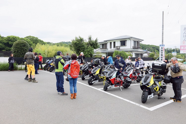 ときには大集団になることもあるマスツーリング。休憩などでは、 周りに配慮して駐車すること。
