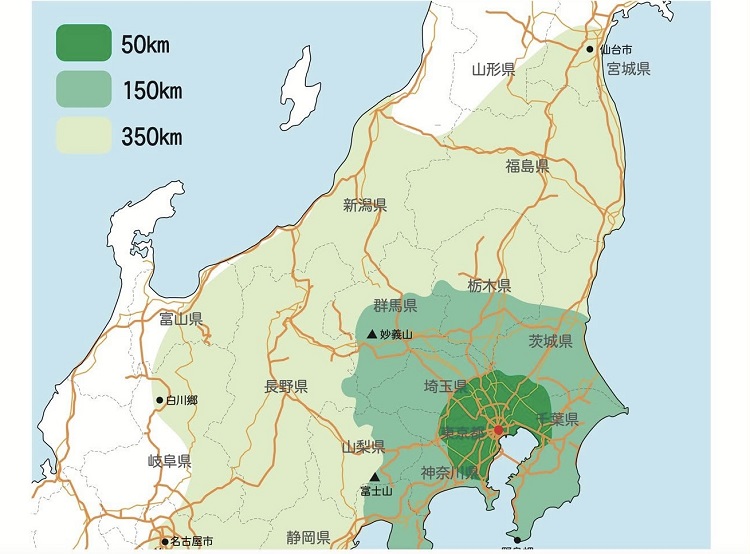 下の図は、都心から片道50㎞・150㎞・350㎞圏内を色分けしたもの。