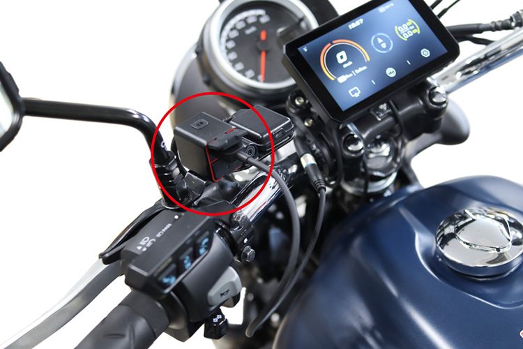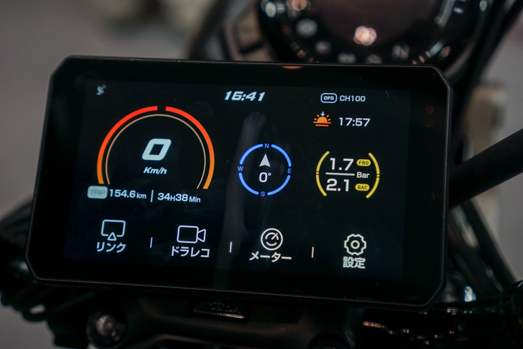 グローブ装着しながらの操作や、モニターが雨で濡れている状態などではタッチ操作がうまく効かず、苦労することもありますが、ハンドル部に別体の物理スイッチを用意することで、常に変わらない操作が可能。