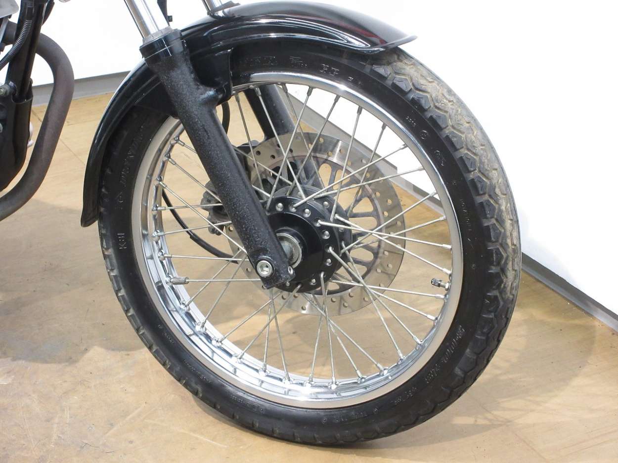 ビッグボーイフロントフォークにはフォークブーツがついてトラッカーイメージを追求。文中では対比のために「スモールガール」と呼んでいるスタンダードモデルはボルティと同じフロント18インチホイール。後に登場した「ビッグボーイ」はフォークを延長してフロント19インチを採用。K180タイヤを組み合わせたことでダートトラックイメージを強化した。