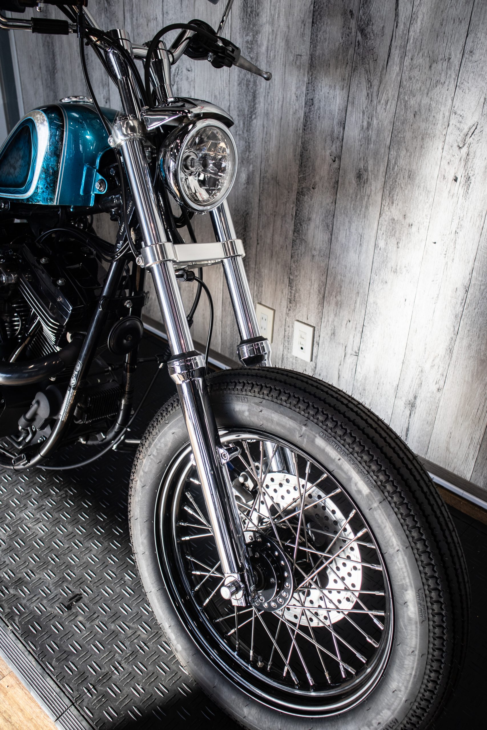 これにより、フロントフォークの幅を純正のワイドからナロースタイルと呼ばれる狭い幅に変更し、フリスコスタイルらしいスタイリングを実現しています。