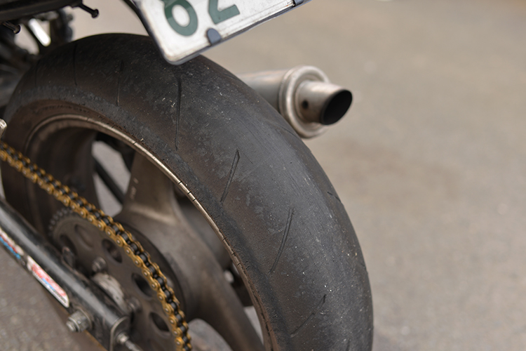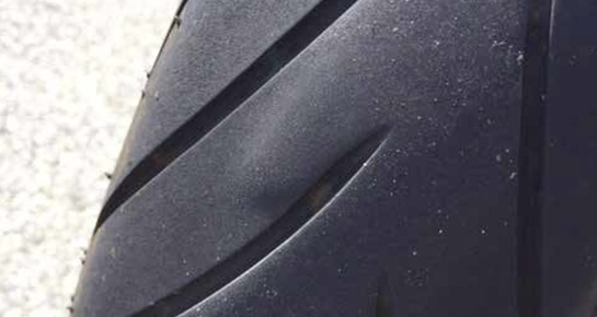 例えば公道を走っているバイクのタイヤはセンターから減っていくものですが、抜けすぎている場合範囲が広がってサイド付近まで減ってしまったり、加減速でタイヤが変形してブロックパターンが変に削れたり、最悪剥離することも。