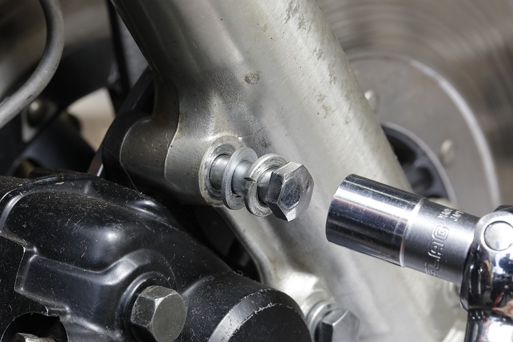 先のキャリパーボルトは通常の六角頭のため平ワッシャーとスプリングワッシャーを使用しているが、この車両の純正キャリパーボルトはフランジ付きなのでワッシャーを使用せず締め付けている。Q.平ワッシャーとスプリングワッシャーを付ける順番は?