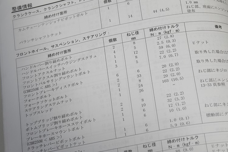 ホンダCBR250R用サービスマニュアルの整備情報に記載された締め付けトルクの例。ネジ径がM8でも、締め付け箇所によって27N・m、22N・m、20N・mとトルクが使い分けられている。